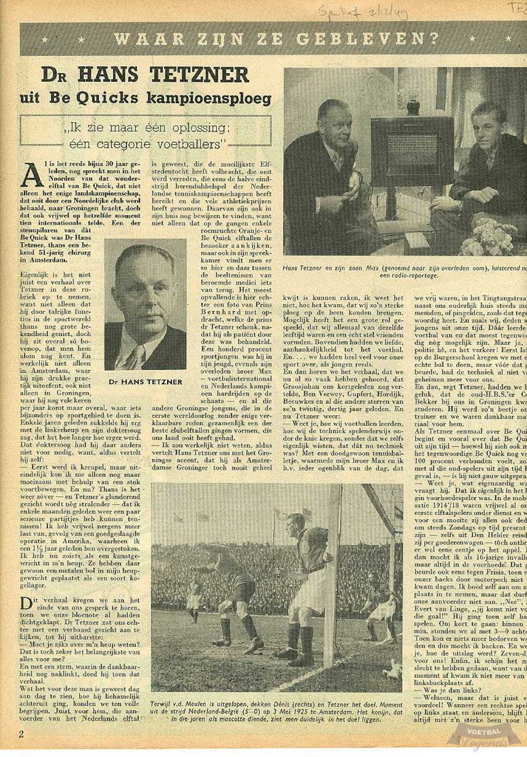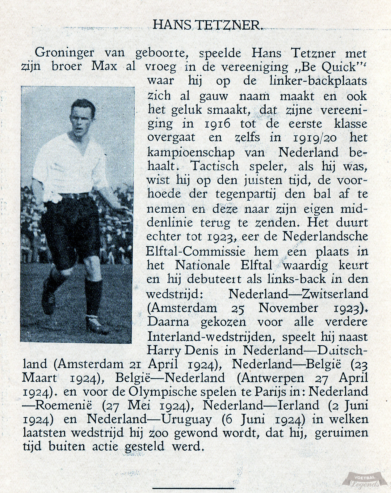 Gek werden de Duitse voetballers op 21 april 1924 van Hans Tetzner. De linksback van Be Quick had in samenspraak met zijn boezemvriend Harry Denis de buitenspelval bedacht. Tientallen malen trapten de Duitsers in de truc, waar ze nooit eerder mee te maken hadden gehad. De gasten vonden dat er sprake was van een irritante vorm van onsportiviteit, maar Tetzner, die deze grap al bij Be Quick had geïntroduceerd, kwam niet meer bij van het lachen. Hans Tetzner was bij zijn debuut als international meteen al aanvoerder. In 1925 was hij reserve voor Zwitserland-Nederland en toen maakte hij zich verdienstelijk als grensrechter.