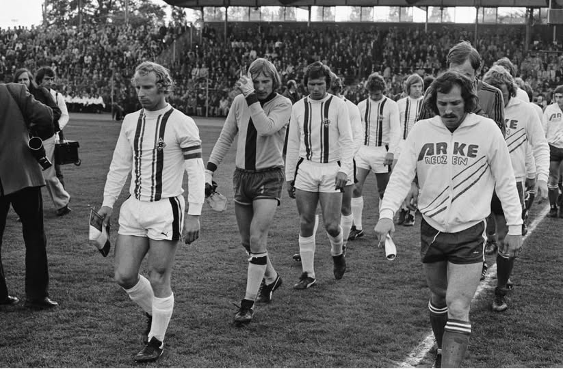 Vandaag in 1975 speelden FC Twente en Borussia Mönchengladbach de return van de UEFA Cup finale. Na de 0-0 in de heenwedstrijd verloor FC Twente de return in het Diekman stadion met 1-5 door onder meer drie goals van Jupp Heynckes (foto Nationaal Archief: beide teams met aanvoerders Drost en Vogts betreden het veld).