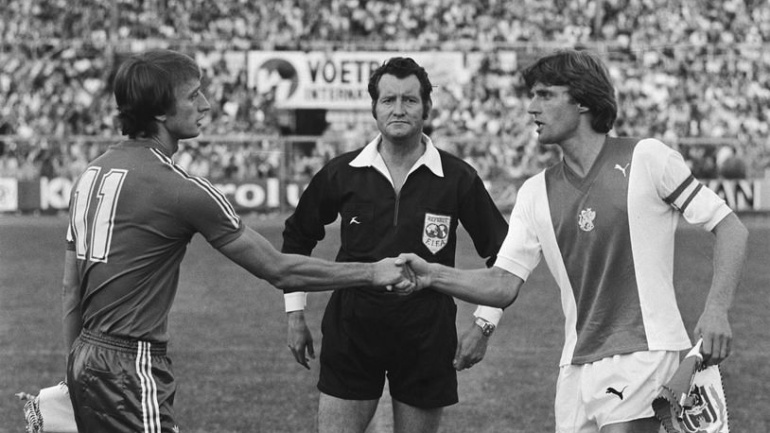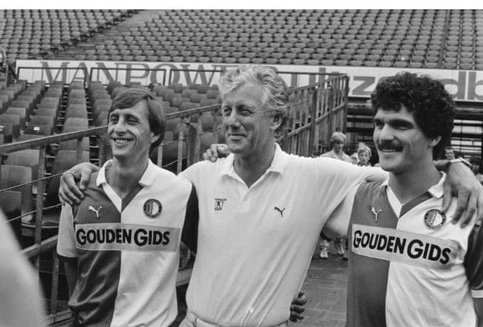 Vandaag is Michel van de Korput 69 jaar. De verdediger speelde in de jaren ’70 en ’80 o.a. voor Feyenoord, FC Torino en 1. FC Köln. Met Feyenoord Rotterdamwon de 23-voudig international in 1984, een elftal met Cruijff en Ruud Gullit, zowel de landstitel en KNVB Beker (foto Nationaal Archief: Van de Korput rechts naast trainer Libregts en Cruijff in 1983.