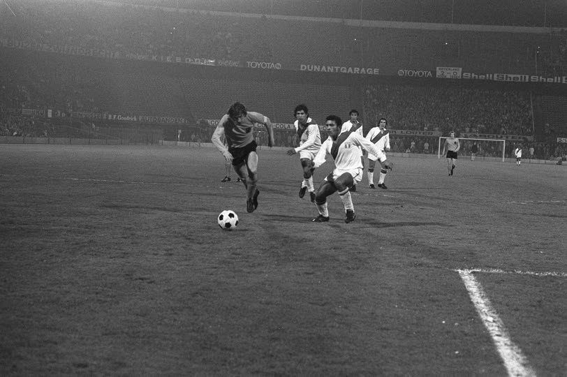Vandaag 53 jaar geleden speelde het Nederlands elftal een vriendschappelijke wedstrijd tegen Peru. Door doelpunten van Klijnjan, Van Hanegem en Schneijder won Nederland in het stadion De Kuip met 3-0. Op de foto van het Nationaal Archief is sterspeler Johan Cruijff in duel met de verdediging van Peru.