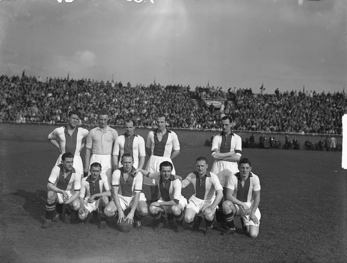 Vandaag 21 jaar geleden overleed Rinus Michels. De aanvaller speelde tussen 1945 en 1958 269 wedstrijden voor Ajax en scoorde 122 doelpunten. Met de Amsterdamse club werd de latere succescoach van onder Ajax, FC Barcelona en het Nederlands elftal als speler 2x landskampioen (foto Nationaal Archief: Michels staand uiterst link voorafgaand aan de wedstrijd Ajax – DWS op 19 februari 1950).